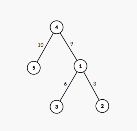Each of the next N -1 lines contains three integers ~u_i~, ~v_i~, and ~w_i~ ~(1 ≤ u_i, v_i ≤ N, 1 ≤ w_i ≤ 10^9)~,describing the i-th edge connecting node ~u_i~ and node ~v_i~ with an initial weight (latency) of ~w_i~.