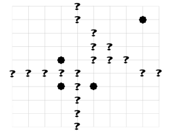 Ví dụ, nếu thị trấn kiến có 10 đường phố ngang và 10 đường phố dọc, có 4 điểm giao cắt có ô thì các điểm có dấu '?' là các điểm ướt (hình dưới):